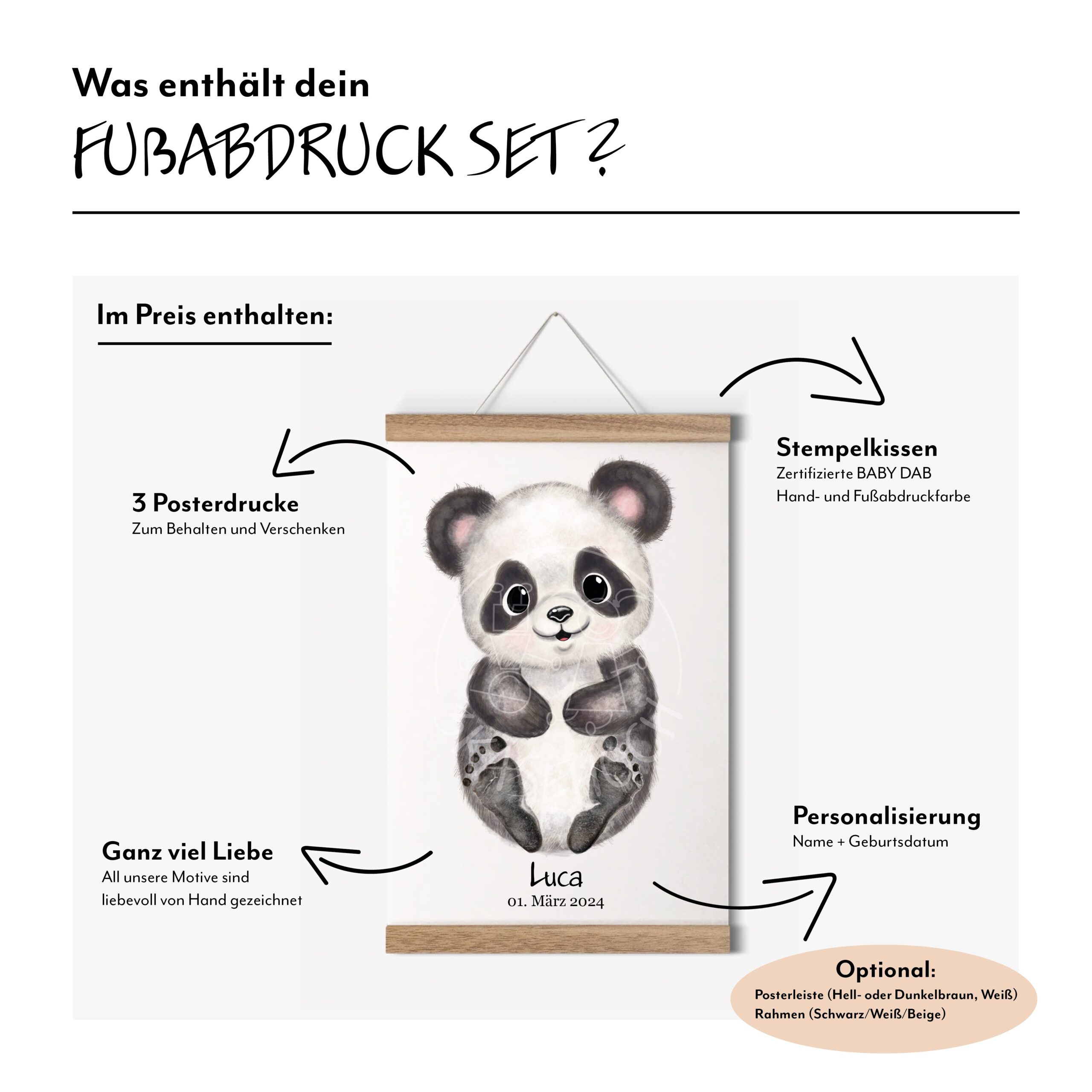 Unser niedliches Fußabdruck Set enthält 3 Posterdrucke, EU zertifizierte Baby Fußabdruck Farbe, 1 detaillierte Anleitung, Handmade Verpackung – Rahmen / Posterleiste optional