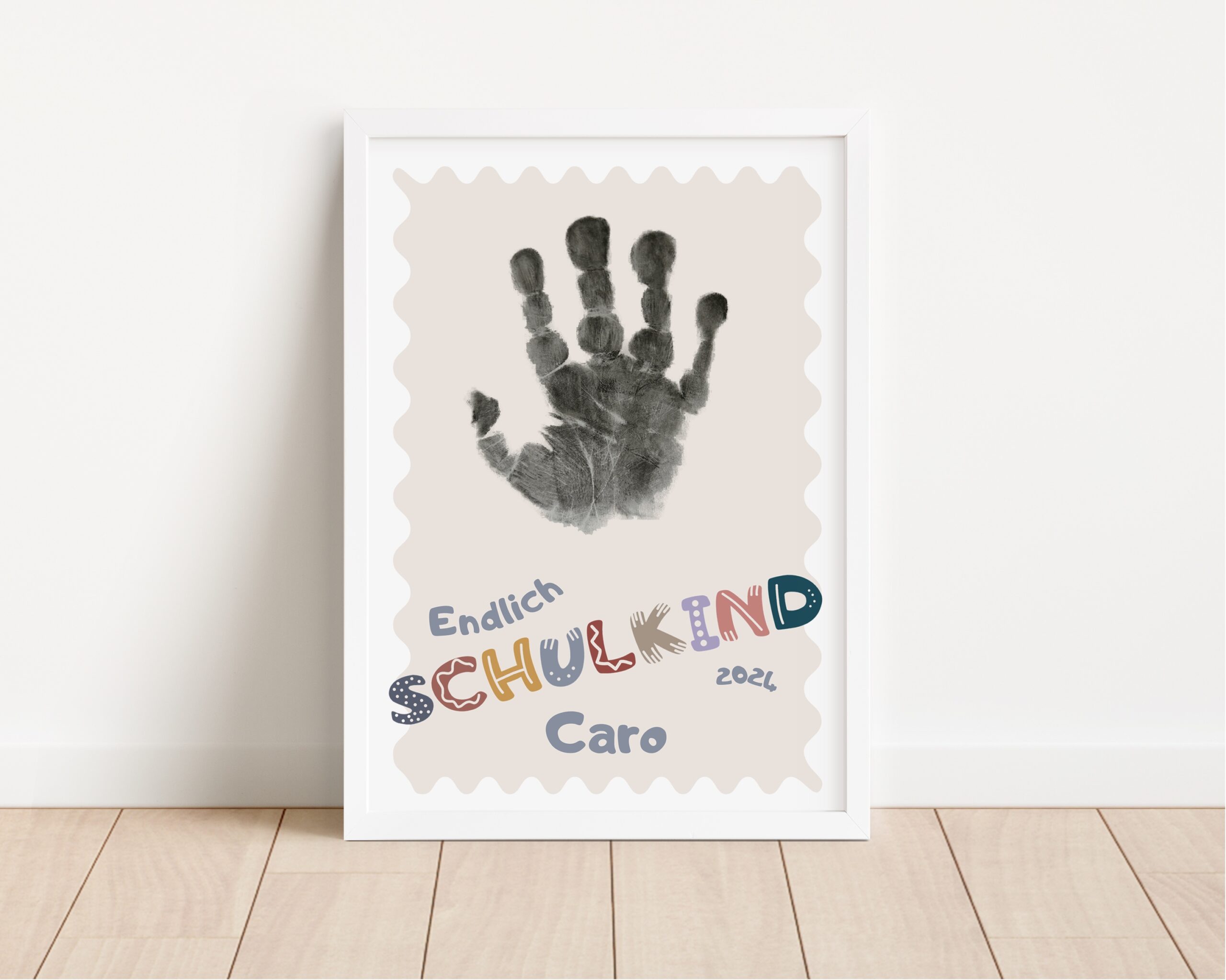 Das Kind kann ganz easy selbst die Hand mit der beiliegenen Farbe einfärben (Anleitung liegt bei) und seinen Handabdruck direkt auf das Poster stempeln. Das Poster ist mit dem Name / Kosename des Kindes individualisierbar und wird zusammen mit einem passenden Stempelkissen geliefert, sodass man direkt loslegen kann. Optional kann ein Rahmen dazubestellt werden, um das Geschenkset für das Schulkind 2024 perfekt abzurunden.