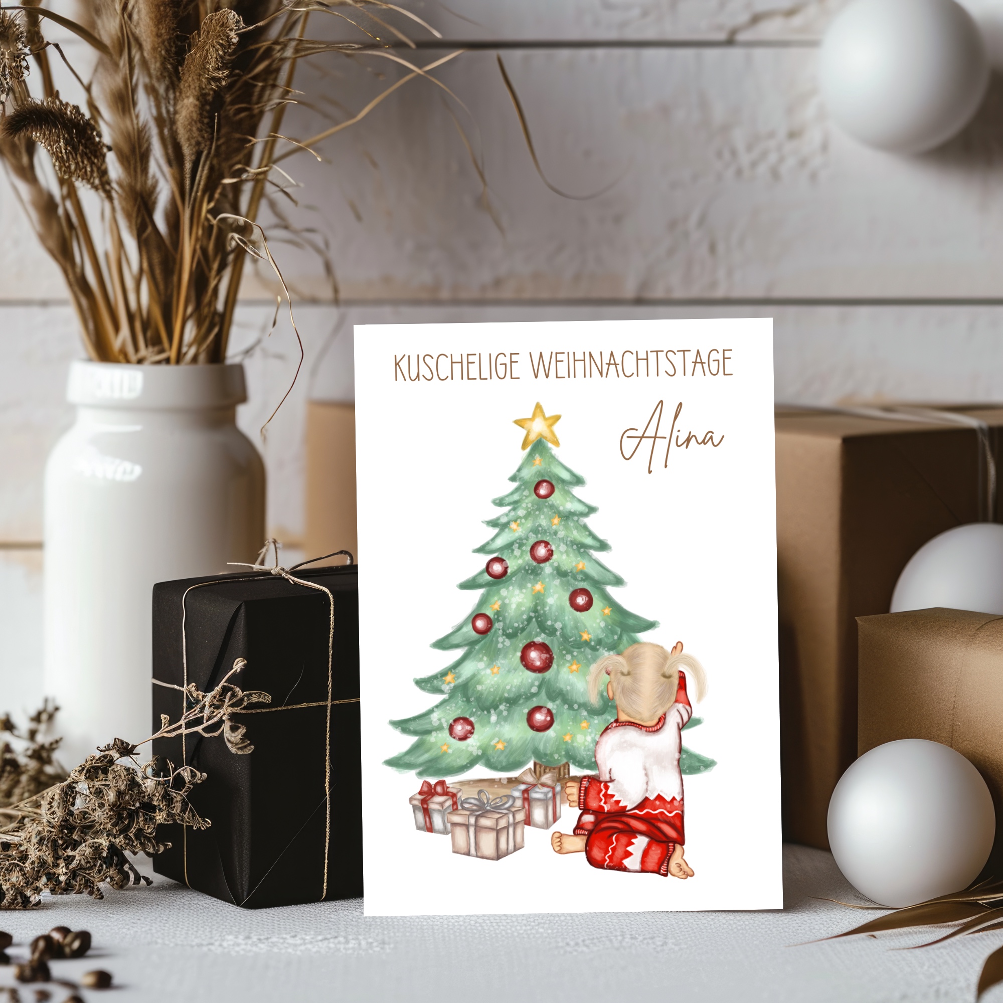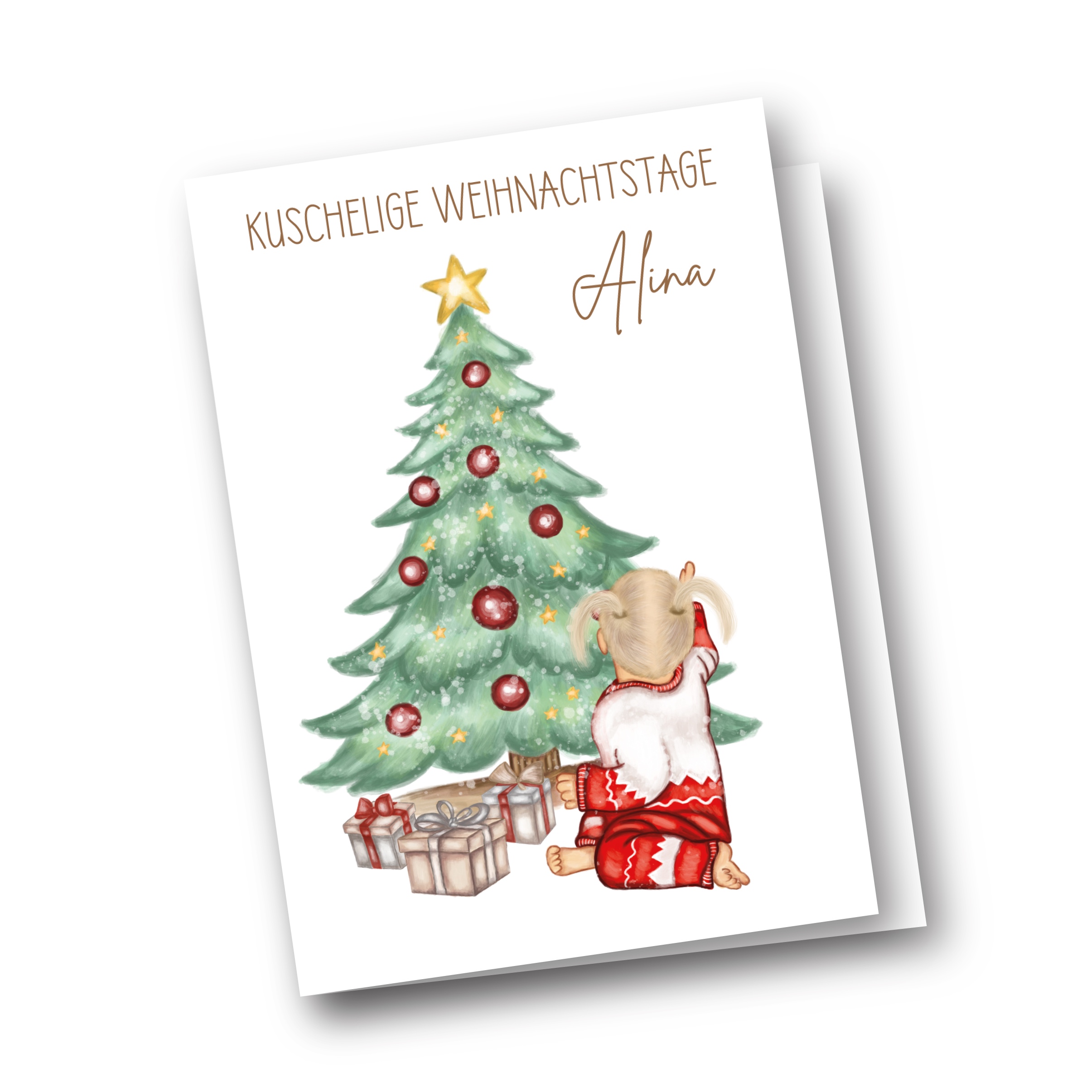 Schenke deinem Kind eine ganz besondere Weihnachtserinnerung mit unserer personalisierten Weihnachtsgrußkarte „Kuschelige Weihnachtstage“, personalisierbar mit den Name des Kindes (Haarfarbe wählbar)