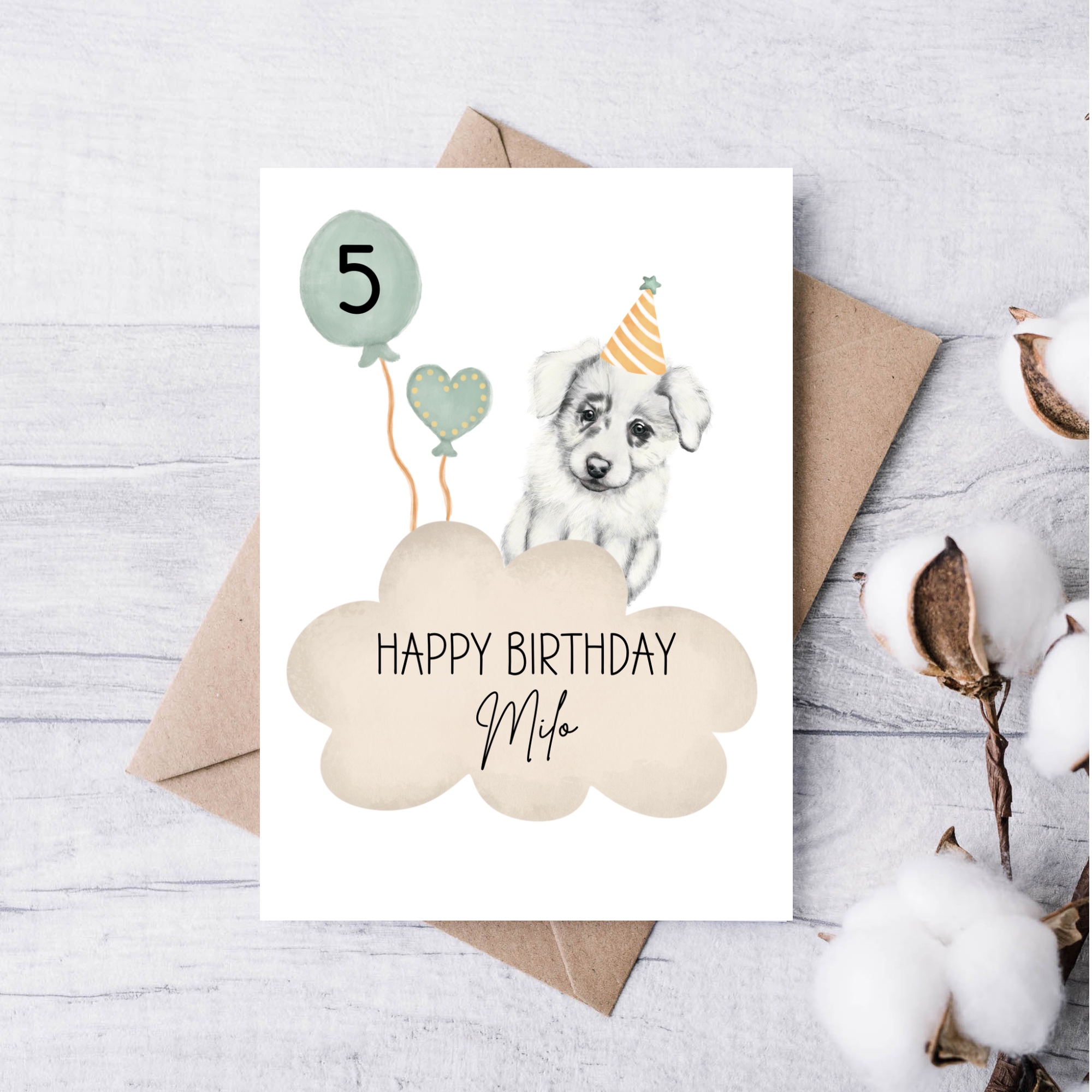 Geburtstagskarte Kind Wolke – personalisiert mit Name & Alter - Hundewelpe beige/braun