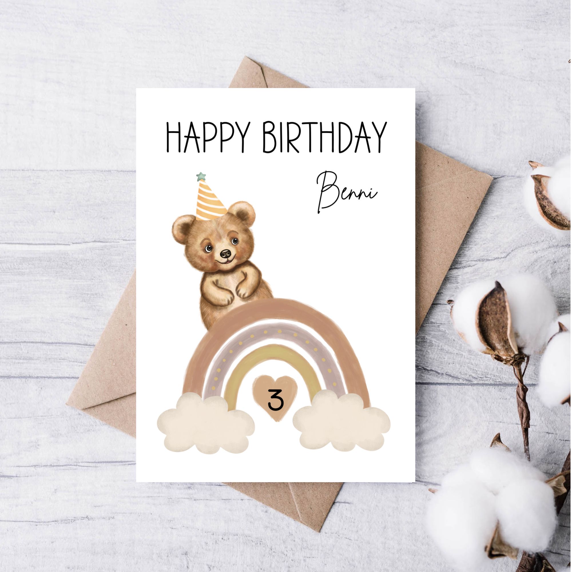 Geburtstagskarte Kind Regenbogen – personalisiert mit Name & Alter - Bär