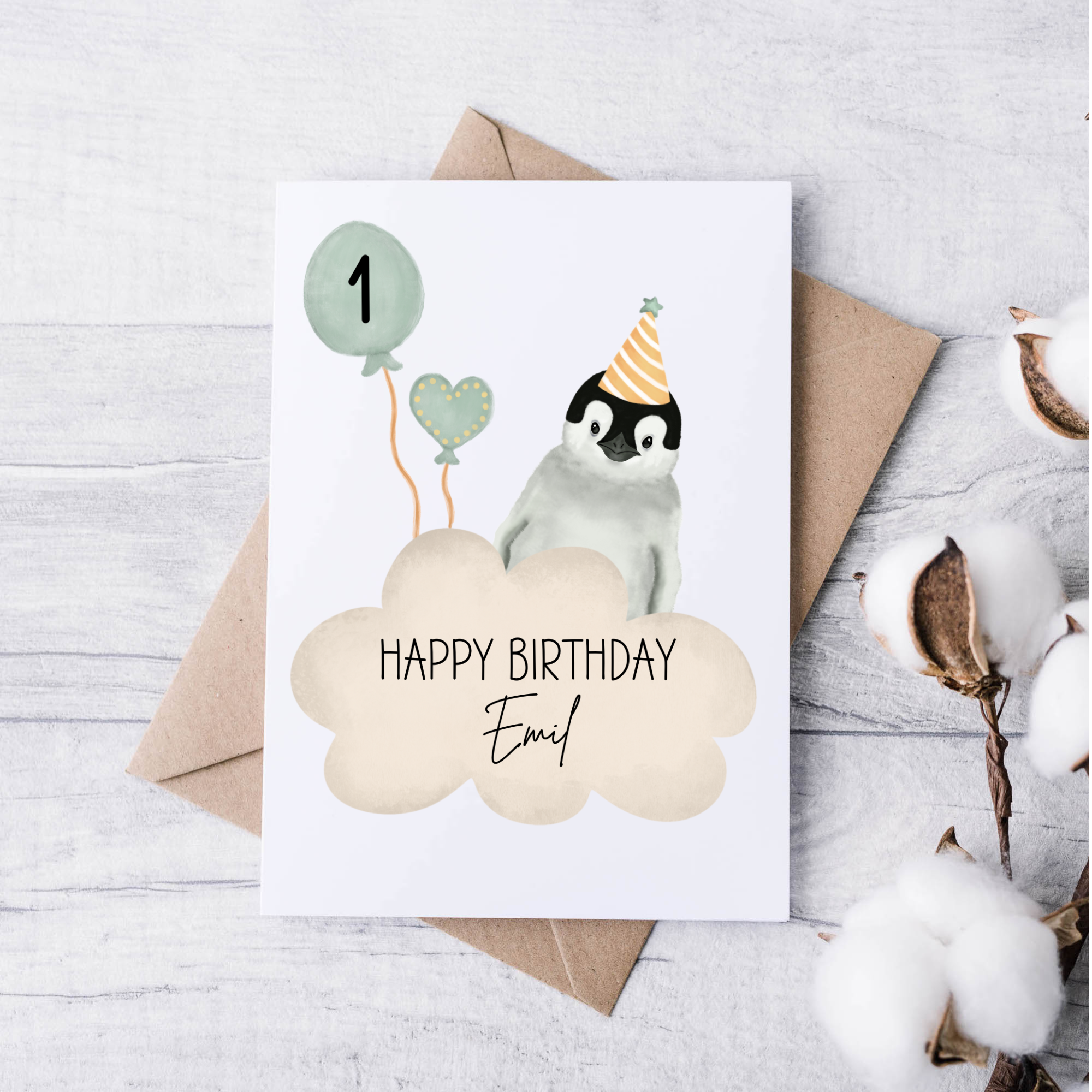 Geburtstagskarte Kind Wolke – personalisiert mit Name & Alter - Pinguin