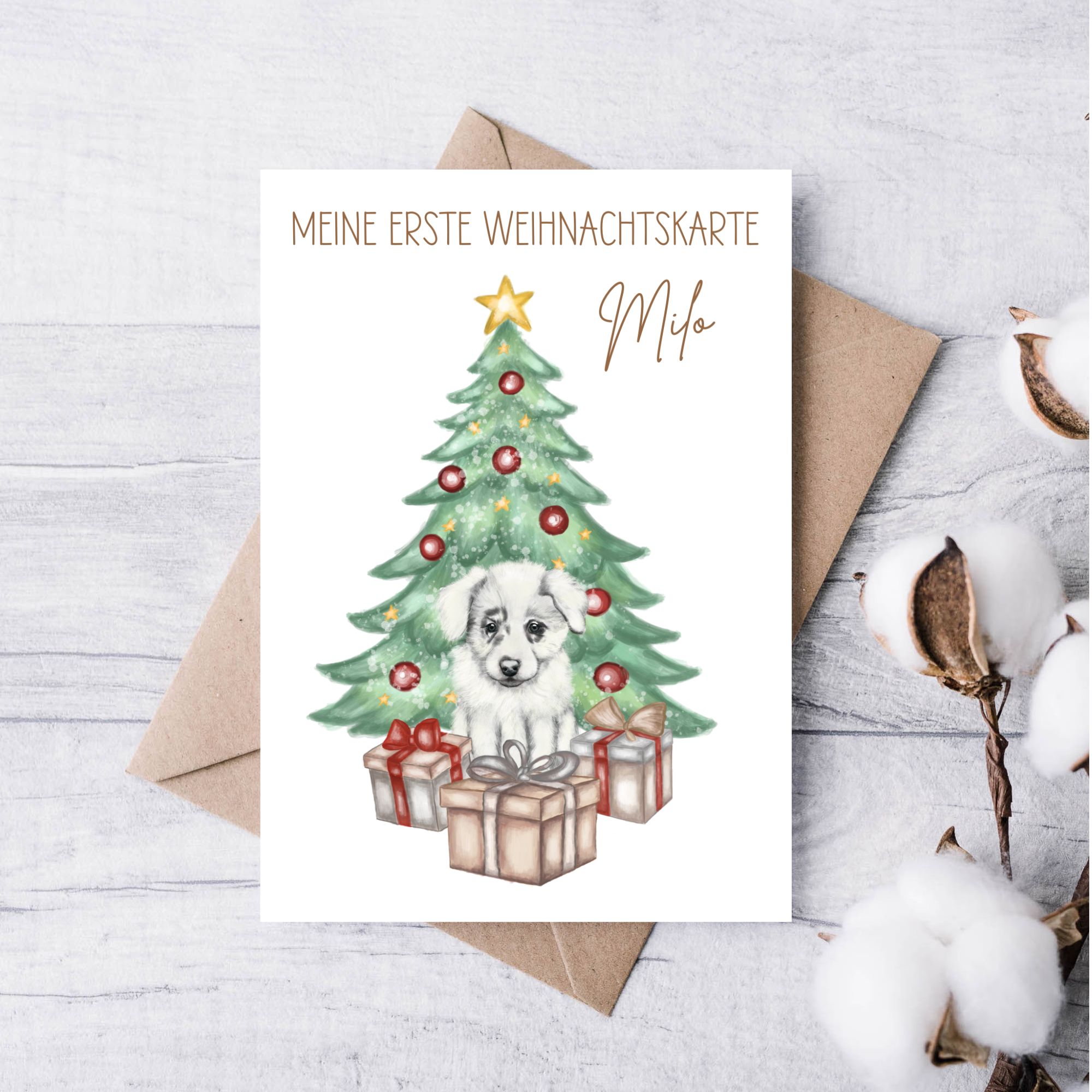 Meine Erste Weihnachtskarte – personalisierbar für Babys - Hundewelpe weiß/grau