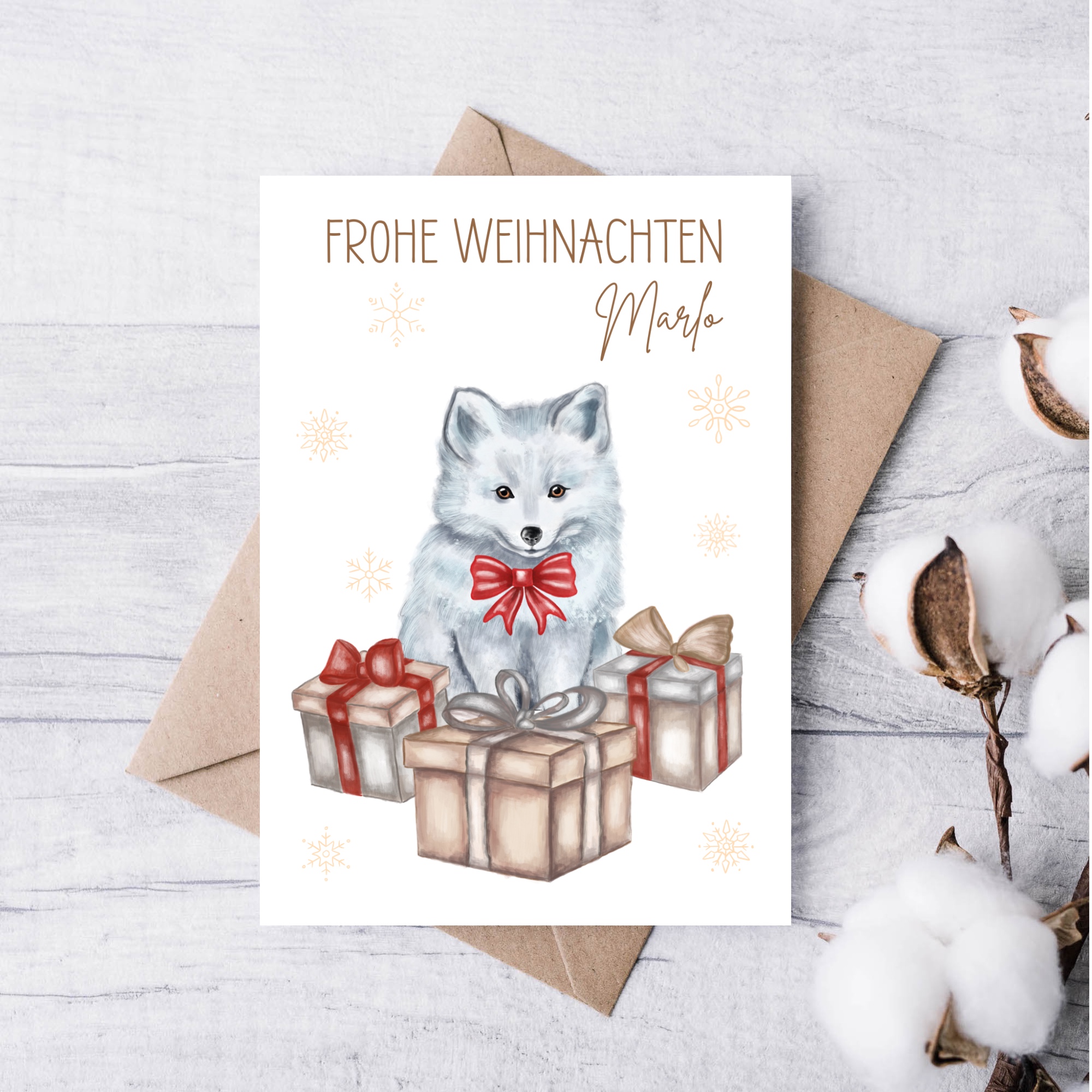 Weihnachtskarte für Kinder – „Frohe Weihnachten“ personalisiert - Schneefuchs