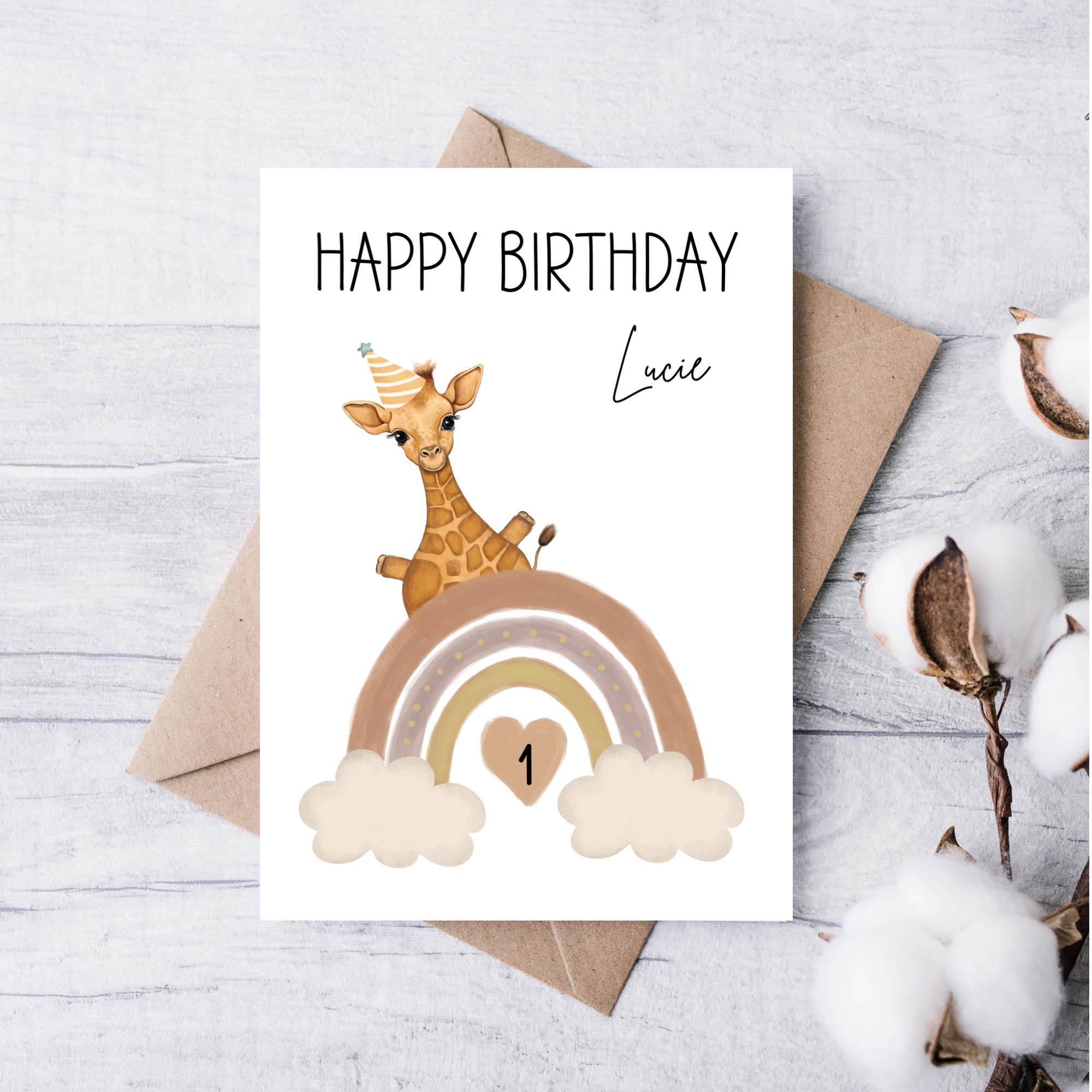 Geburtstagskarte Kind Regenbogen – personalisiert mit Name & Alter - Giraffe