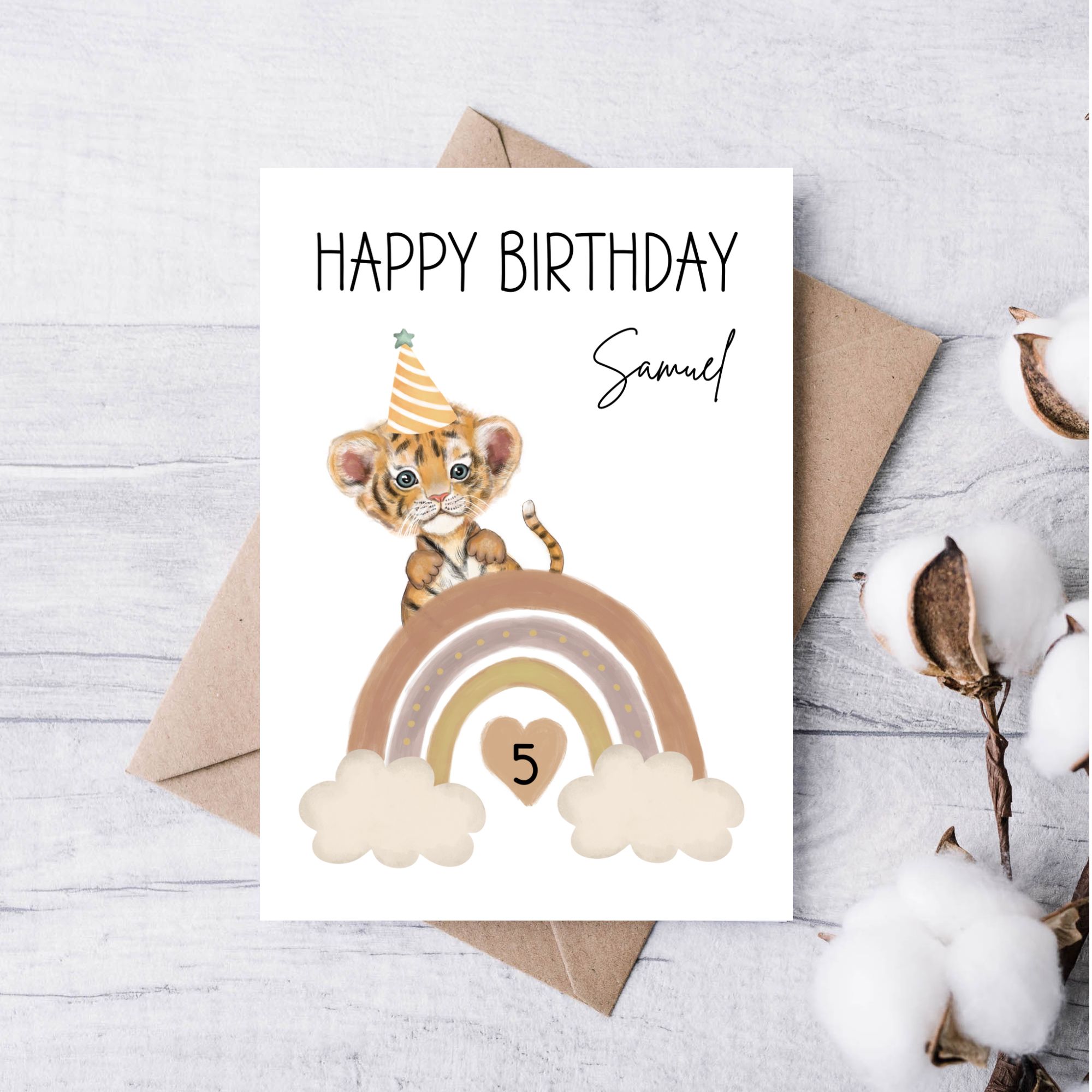 Geburtstagskarte Kind Regenbogen – personalisiert mit Name & Alter - Tiger