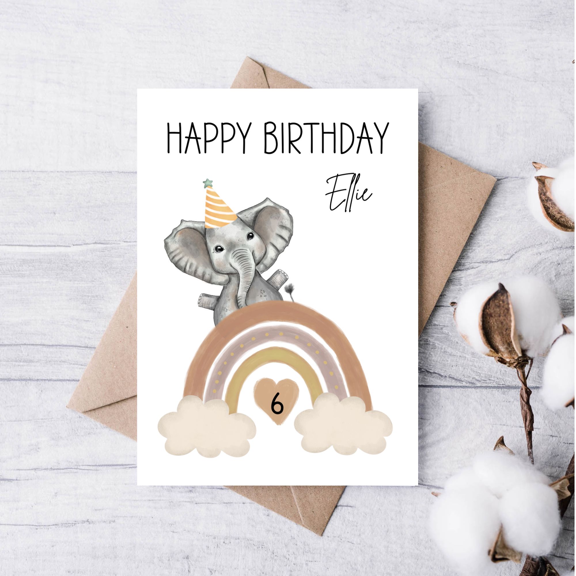 Geburtstagskarte Kind Regenbogen – personalisiert mit Name & Alter - Elefant